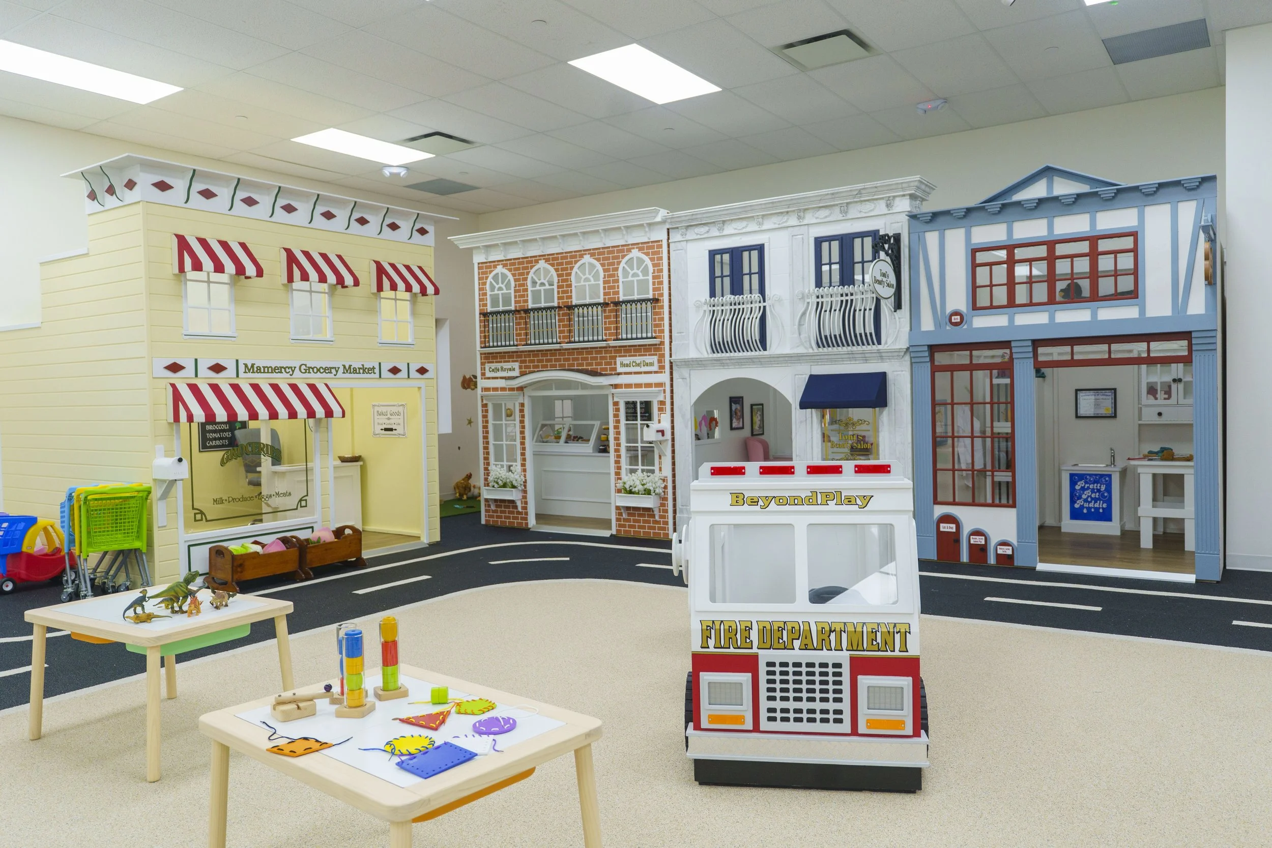 Our mini Canadian town to explore life through pretend play: shop at the grocery store, serve snacks at the café, rescue a stuffed puppy, or be a hero firefighter!